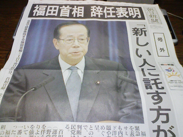 21時30分から福田首相会見。内容は不明という第一報で1年前のことが頭をよぎった。でも、まさか、2年連続はないだろうな〜。って思ってたら、びっくり!!辞意表明。公明党に事実上支配されて、意に反する政策を打つぐらいならやめるってのは分かる気がするなぁ〜。でも、首相なんだから、正しいと確信している政策は再可決連発してでもやるっつー勢いでやって欲しかったっすね。やっぱり、“これをやりたいんだ!!”ってのがないうちはいかに周りに担がれようとも責任ある立場に就いちゃいけないってことかもしれない。