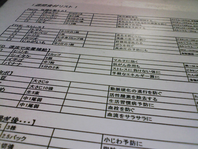 今年の公約の1つである「食による安全」。早速、1週間で食べる32食材をリスト化した。インターネットで調べて栄養価の観点から32食材とその捕食量をピックアップ。というか、パクった。。。確実な運用のためにチェックボックスをつけて手帳に装備。量はともかく、まずは32食材を1週間のうちに網羅することから始めます!つーことで、アパート備え付けの1ドア冷蔵庫は、野菜専用に改組。