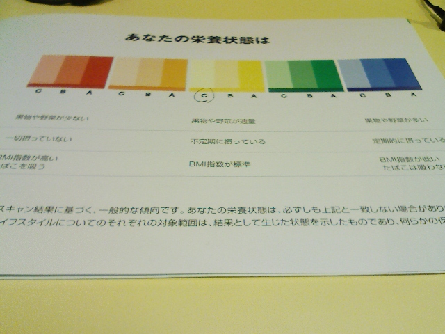 そーいえば、いつのまにか、気づいたらスキャンしてた。カロテノイド測定。1月から開始した食材リストの効果やいかに?結果は、、、15段階中9番目。シブい。野菜からバランスよく栄養素を取るというのは難しい。サプリ検討へ。